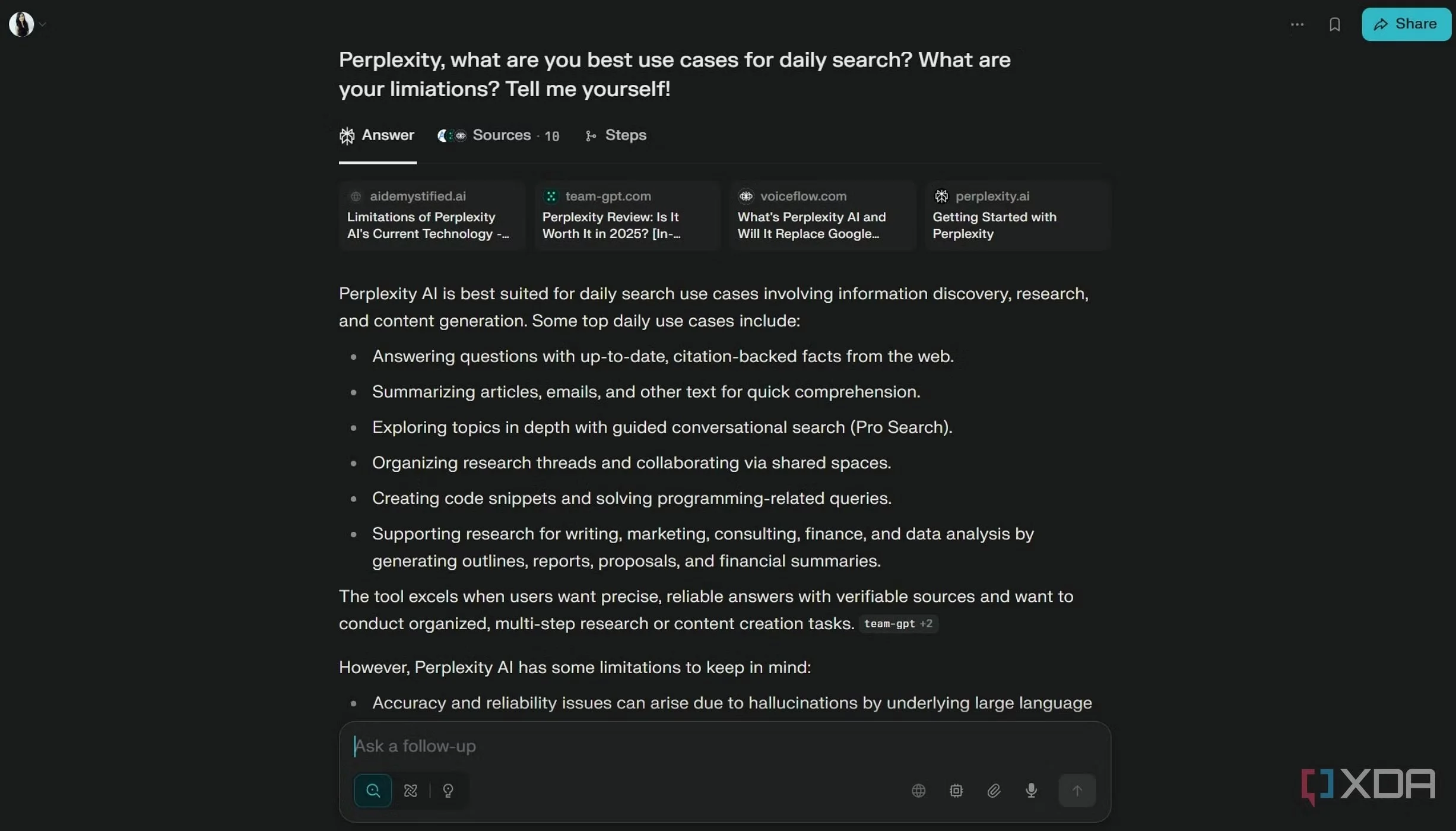 Excellent demonstration of grounding with citations in a clean, scannable interface. Sources are prominently displayed and linked, with related follow-ups and visual summaries—ideal for verifiable, trustworthy agent outputs.